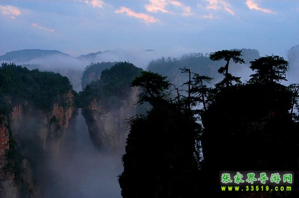 在“后花園”的對面,是一座巍峨的山巒,山上古木參天,遮天蔽日。森林中常有野山羊出沒,夜深人靜之際,常能聽到野羊羔“咩洋”地叫聲,因此被稱作“羊寨”。民國時期,此地曾為土匪占領(lǐng),直到現(xiàn)地,山上還殘留有卡門、暗堡、斷壕、屋場、水井、碓臼、磨坊等殘跡。粗大的松樹上還留有土匪當(dāng)年留下的“V”字型標(biāo)志。站在“山寨”上,舉目眺望,可看見金鞭溪全景,只見一條美麗的溪水從數(shù)百座石林中緩緩穿過,顯得是那樣的幽靜、和諧。從“后花園”向前步行約100米,便是袁家界又一處絕世奇觀——迷魂臺,走上迷魂臺,只見上百座山巒拔地而起,峰涌而至,它們姿態(tài)萬千、氣勢非凡;有的似“天狗望月”,有的像“海螺出水”;有的像“將軍列隊”,有的如“一柱擎天”。幾道山坳和屏障將這些山巒有序的分開,使這些石峰更顯得層次分明,井然有序,在萬道霞光的點綴下,顯得蔚為壯觀,不同凡響。這更像是一幅畫家筆下的水墨丹青,“迷魂臺”攬勝,真宛如仙境神游啊。