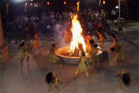 “擺手”,土家人稱為“社巴”,正月初三至十七日這段時間稱為“社巴日”或“社巴節(jié)”,歷史上,土家人在各村寨都建有“擺手堂”和神廟。在神廟內,還供有土家族的祖先八部大王或土司王神像.每到“社巴節(jié)日”都有歌舞活動。這種調年擺手舞叫“社巴”也有叫“調年”的,有強烈的戲劇性,有故事情節(jié),還有人物,它由拔普(公公)、拔帕(婆婆)、阿達與阿柯等男女老少集體在而舞。 擺手舞的形式一般是這樣的:在擺手堂的中央高掛龍旗,四方點燈,由金童玉女給土家人用銅盆洗手,再從香火山取來神火,然后在龍旗下點燃3堆篝火。隨著3聲炮響,先由梯碼法師(巫師)手舉八寶銅鈴作前導,大家跟著翩翩起舞,徹夜不眠。 擺手舞的主要動作在走路與彎腰時,擺動同邊手。擺的形式,一般分單擺、雙擺、環(huán)擺、花擺、插擺與擺七步等,因為擺得多,所以稱“擺手舞”。擺手舞,還分“小擺手”與“大擺手”。“小擺手”的規(guī)模的較小,形式與內容主要是模擬挖地、播種、薅包谷草、摘包谷或者是在田里插秧、扮谷、曬谷等多項農事活動,也有表現(xiàn)打獵或漁獵活動的。有些地方的“小擺手”舞也有表現(xiàn)吹木葉、接新娘等生活內容的。 “大擺手”,主要是規(guī)模大,參加的單位往往是幾個甚至幾十個村寨,參加的人數也幾千人或上萬甚于幾十萬人的。“大擺手”的內容比“小擺手”豐富,除表現(xiàn)農事活動和土家人生活以外,還有表現(xiàn)軍事活動的。“大擺手”的形式,一般先由領頭人手執(zhí)五彩布條做的“柳巾”指揮,接著是“梯碼”隊(由巫師組成)和鼓樂隊,同時,男女擺手舞隊也一起入場。這其中還有特別引人注目的披甲小旗隊(他們身披打花鋪蓋象征盔甲)。這支披甲小旗隊手執(zhí)小花旗,顏色有紅有綠,有黃有藍,色彩艷麗,五彩繽紛。他們表演的內容與形式,主要是反映人類起源,先民軍事活動、部落搬遷等,舞蹈動作難度較大,為廣大土家人所喜愛。