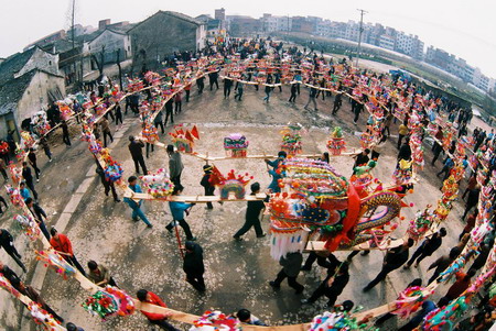 龍舞是中國(guó)民間體育藝術(shù)。大庸境內(nèi)的板凳龍是 別具一格的龍舞形式。尤其桑植縣白族人民,對(duì)舞板 凳龍有著特殊偏愛(ài)。 白族同胞耍板凳龍,相傳起于漢代,由白族先民 “舞龍求雨”的宗教活動(dòng)演變而來(lái)。 板凳龍有兩種樣式。一種是簡(jiǎn)式板凳龍,由二個(gè) 舉長(zhǎng)凳為頭,一人在后選適當(dāng)“舞臺(tái)”表演;另一種 是“篾扎板凳龍”,即用竹篾扎成龍形置于板凳之上 ,以木腳示龍爪,造型美觀,逼真。耍板凳龍又分兩 種舞式,一為獨(dú)凳龍,一為九節(jié)龍(九張板凳相接)。 舞板凳龍動(dòng)作有“二龍搶珠”、“黃龍穿花”、“二 龍戲水”、“金蟬脫殼”、“黃龍盤(pán)身”等。永順、 慈利還流行草把龍,其龍耳稻草扎成。龍舞還有“干 龍”、“濕龍”之分,“干龍”多為娛樂(lè),“濕龍” 則為求雨。“龍”到之處,百姓必潑水助威,舞者一 身透濕,盛為熱烈歡快。