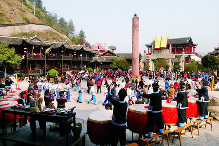 三棒鼓,唐代稱(chēng)三仗鼓,明沈行符《顧曲雜言》 曰:“吳下何來(lái)有打三棒鼓乞錢(qián)者,余幼時(shí)有見(jiàn)之也, 起于唐咸通中(公元865年)”約于明代傳入本境, 并逐漸成為群眾增聞樂(lè)見(jiàn)的民間藝術(shù)形式。每年春節(jié) ,藝人們結(jié)伴走村竄寨拜年,表演對(duì)象不分貧富,戶(hù) 戶(hù)必到。如遇貧寒之家,表演者將別家贈(zèng)送禮品相送 ,意在人人過(guò)節(jié)歡喜。充分體現(xiàn)出土家族人熱情好客 ,心地善良的民族性格,對(duì)加強(qiáng)民族團(tuán)結(jié)有一定作用 。 三棒鼓通常由三至五人組成,一人擊鼓唱詞,一 人鑼鈸配樂(lè),一人?;ò簟;ò羧L(zhǎng)一尺,舞者 左右手各持一根,將另一根拋在空中,左右開(kāi)弓,擊 打空中花棒使之不落地。也有以刀代棒,以五刀代三 棒的技藝。技藝高強(qiáng)者,突然把刀拋得極高,來(lái)一個(gè) 眼花繚亂,不禁稱(chēng)絕。打三棒鼓,通常有“鬧春耕” 、“收割打場(chǎng)”、“慶豐收”、“拜年節(jié)”四套,分 “鯉魚(yú)跳龍門(mén)”、“玉女穿梭”、“板巖漂灘”等項(xiàng) 目。打三棒鼓技巧性強(qiáng),表演時(shí)需高度集中,用力適 當(dāng),貫通一氣,并與演唱者默默配合。