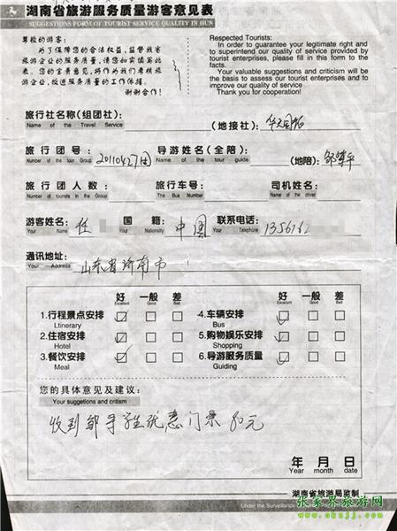 2011年4月29日任先生一行2人旅游質(zhì)量反饋