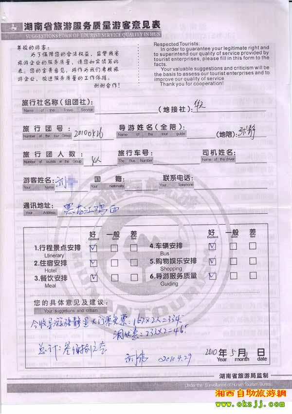 2010年5月1日黑龍江劉先生旅游質量反饋