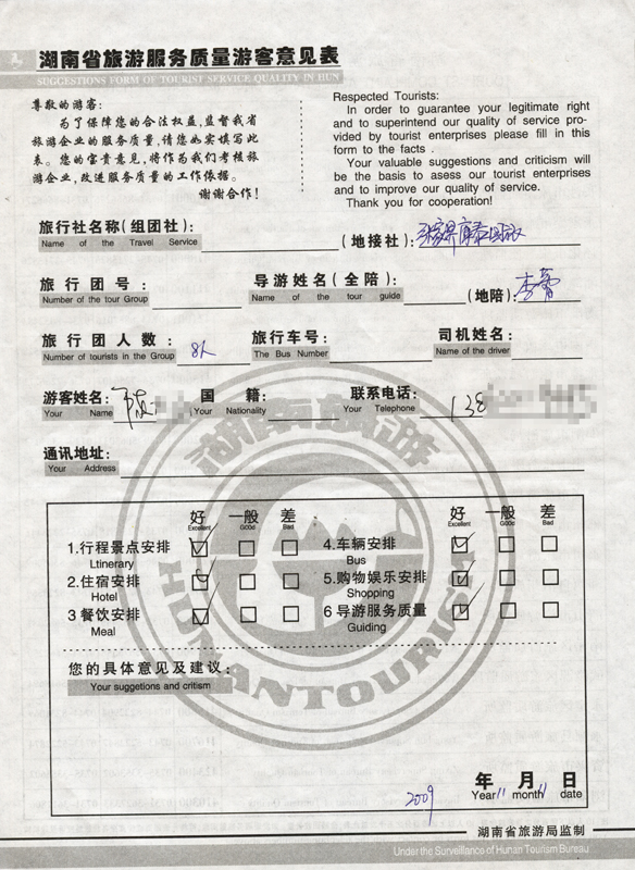 2009年11月11日陳先生一行8人旅游接待質(zhì)量反饋單
