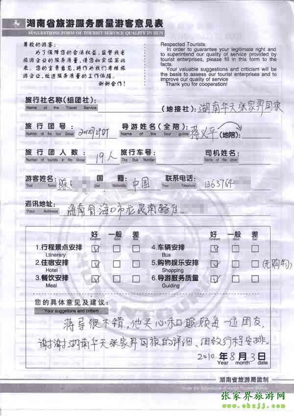 2010年8月3日海南陳小姐一行19位旅游質量反饋