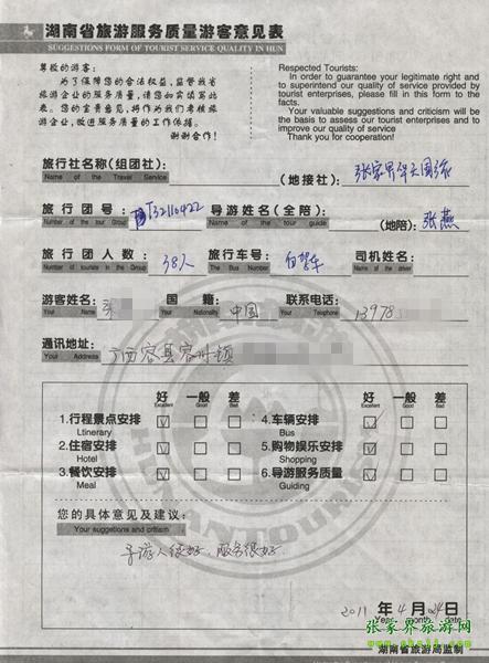 2011年4月24日梁小姐一行38人旅游質(zhì)量反饋:導(dǎo)游人很好,服務(wù)很好