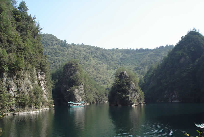 其位于武陵源區(qū)城南1.5公里處,是武陵源風景名勝中的精品景點。它是一座罕見的高峽平湖,四面青山,一泓碧水,風光旖旎,是山水風景杰作。在此蕩舟,還可見到湖心島上“玉瓶開花”、“十女梳妝”、“金龜戲水”、“青蛙鬧春”等佳景。 寶峰湖是一個截流筑壩而成 的人工湖,深72米,長2.5米公里, 以其秀麗的湖光 水色與幽野的洞天情趣成為武陵源水景風光的代表之 作。湖中有兩座疊翠小島,近岸奇峰屹立,峰回水轉(zhuǎn)。