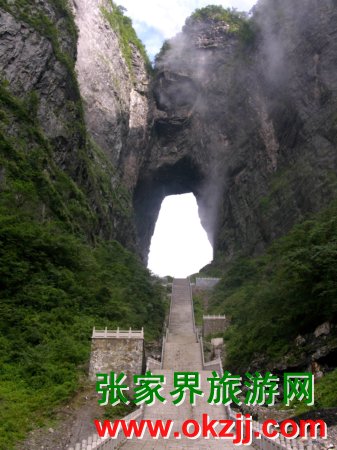 天門山古稱云夢山,又名玉屏山。坐落在張家界市區(qū)以南10公里處。公元263年,因山壁崩塌而使山體上 部洞 開一門,南北相通。三國時吳王孫休以為吉祥,賜名“天門山”。 天門洞,位于海拔1260多米的絕壁 之上,門洞高131.5米,寬37米。據(jù)地質(zhì)專家考證,門洞中央系東西巖層向 斜的交匯處,因擠壓而導致巖 石破碎崩塌,最終于263年形成門洞。天門山海拔1517.9米,因與山下市區(qū)相對高差達1300多米,故尤顯 偉岸挺拔,其天際線之美,堪為山的典型。
